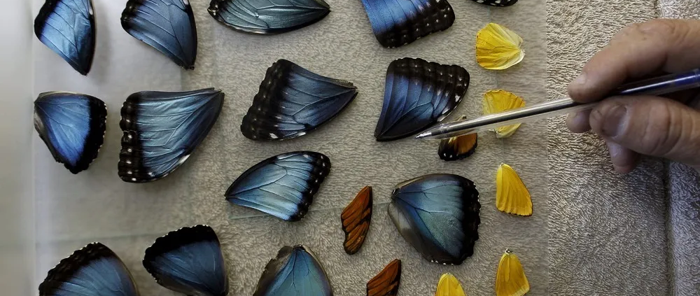 ´´Frander Arroyo, select wings of butterflies at Blue Morpho Butterfly House in Alajuela, Costa Rica, March 10, 2016. According to Arroyo, owner of Blue Morpho Butterfly House, he collects dead butterflies from his garden to mount as handicraft like earrings, necklaces, paintings and rings for export(…)´´