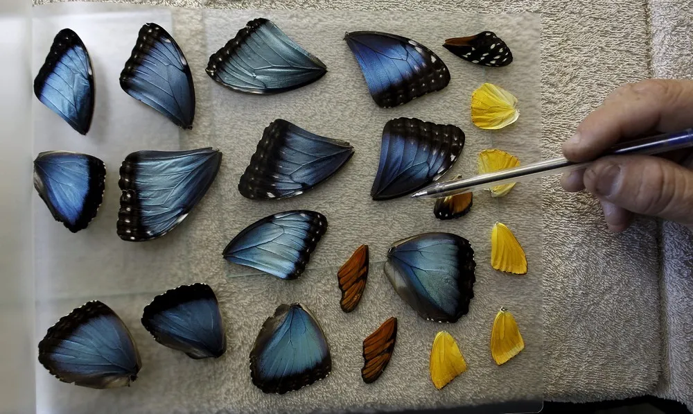´´Frander Arroyo, select wings of butterflies at Blue Morpho Butterfly House in Alajuela, Costa Rica, March 10, 2016. According to Arroyo, owner of Blue Morpho Butterfly House, he collects dead butterflies from his garden to mount as handicraft like earrings, necklaces, paintings and rings for export(…)´´