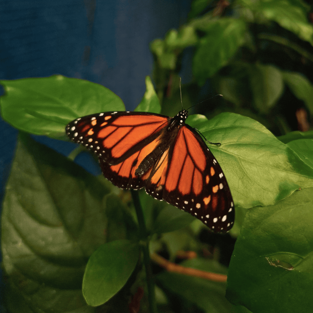 La famosa mariposa monarca (Danaus plexippus) aprovecha el sol de la tarde para regular su temperatura antes del descanso. Una escena que encanta a visitantes de todas las edades.