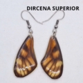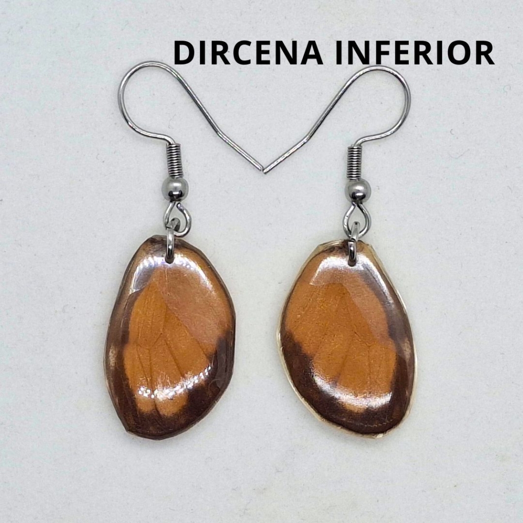 Cada par de nuestros aretes está elaborado con alas reales de Dircena dero, una mariposa tropical de apariencia etérea y translúcida. Sus alas, con delicadas vetas oscuras sobre tonos ámbar y crema, evocan la elegancia de los vitrales naturales y la sutileza de los bosques húmedos costarricenses.