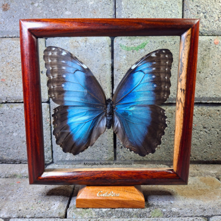 Una obra artesanal única que combina elegancia y naturaleza. Su diseño presenta a la impresionante Morpho helenor narcissus, reconocida por sus alas de un azul iridiscente que evocan majestuosidad y libertad.
