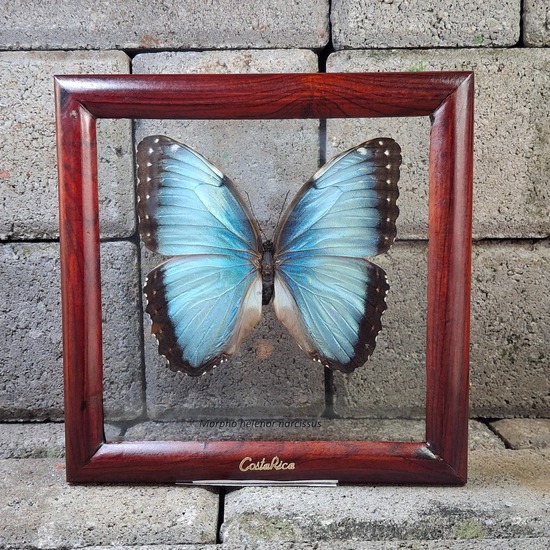 Una obra artesanal única que combina elegancia y naturaleza. Su diseño presenta a la impresionante Morpho helenor narcissus, reconocida por sus alas de un azul iridiscente que evocan majestuosidad y libertad.