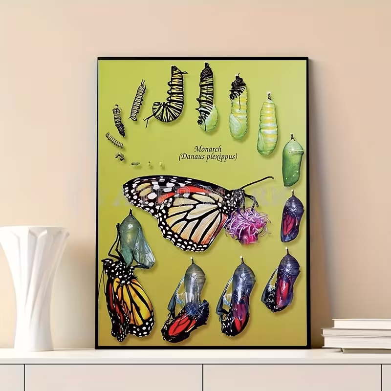 Póster decorativo en canvas que ilustra la metamorfosis de la mariposa Monarca. Colorido, educativo y perfecto para cualquier espacio. (45 x 30 cm)