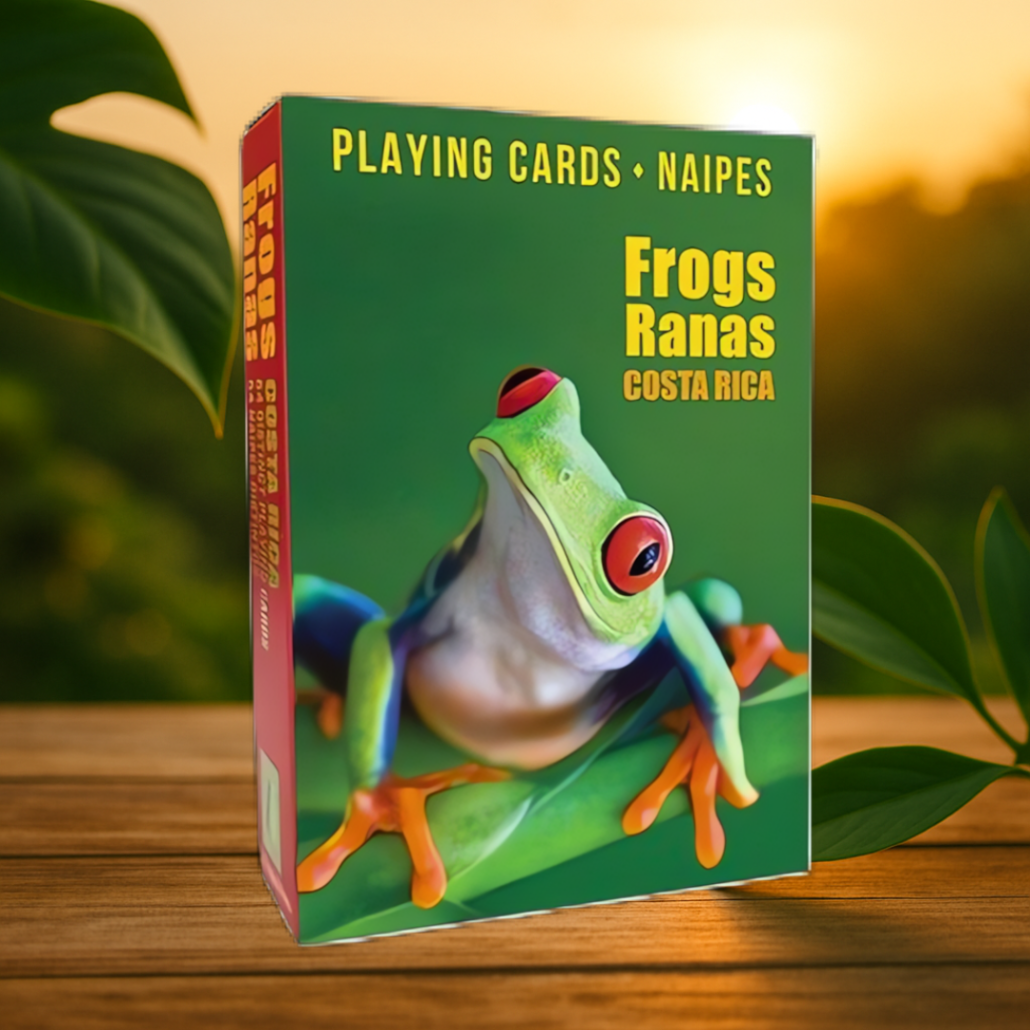 Immerse yourself in the vibrant and diverse world of Costa Rican frogs with our stunning deck of 52 playing cards, each featuring a unique image of one of these incredible amphibians. Among the captivating illustrations is the Hyalinobatrachium valerioi, also known as the glass frog, with its distinctive translucent skin that reveals the delicate beauty within. This collection celebrates the rich variety of frog species found in Costa Rica, from the vividly colored poison dart frogs to the iconic red-eyed tree frog. Perfect for nature lovers and collectors alike, this deck is both a tribute to and a reminder of the importance of preserving these remarkable creatures.