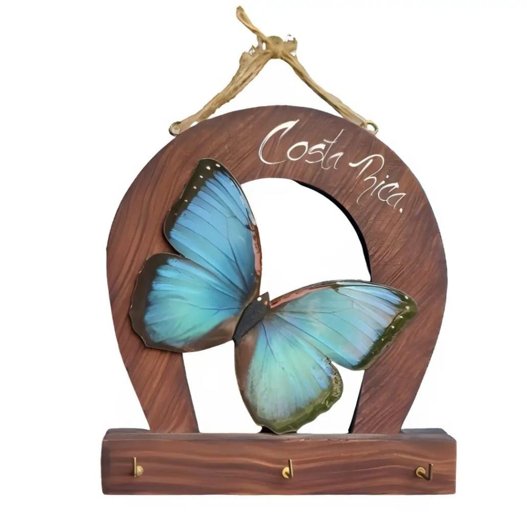 En la parte superior, la inscripción “Costa Rica” refuerza su identidad como souvenir auténtico. En la parte inferior, incluye tres ganchos metálicos ideales para colgar llaves u objetos pequeños, combinando funcionalidad con estética.