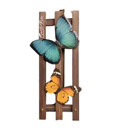 Este portallaves artesanal combina arte, naturaleza y cultura en una pieza llena de vida. Su diseño destaca una hermosa fotografía de una flor tropical en plena floración, sobre la cual se posa una mariposa Morpho Azul en relieve, creando un efecto visual único y elegante.