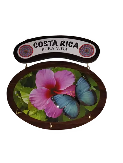 En la parte superior, la frase “Costa Rica Pura Vida” junto con detalles coloridos inspirados en el arte tradicional costarricense refuerzan su identidad como recuerdo auténtico. En la parte inferior, incorpora ganchos metálicos ideales para organizar llaves u objetos pequeños, manteniendo el equilibrio entre funcionalidad y decoración.