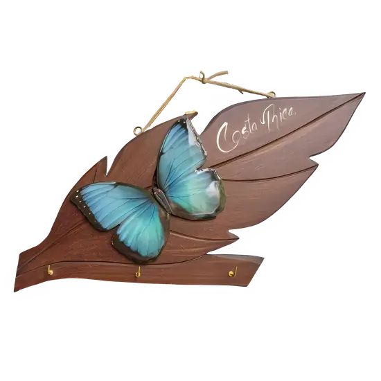 Elegante portallaves artesanal en forma de hoja, con una mariposa Morpho Azul protagonista. Decorativo y funcional, ideal para llevar la esencia tropical a tu hogar. (~25 x 19 x 1.5 cm)